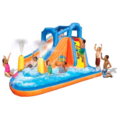 $$$ The Gushing Geyser Water Park will drench you with a constant spray of water as you glide down the slick water slide! You can also splash around in the pool and let the geyser water spray all over you. With the included continuous airflow blower, all of this fun inflates in less than 2 minutes. Heavy Dura-Tech construction ensures lasting strength and durability. With this geyser blasting slide you will keep cool all summer.